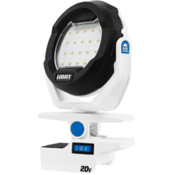 The HART 20V Cordless LED Clamp Light is a perfect addition to any DIYer’s toolbox. This light is a master of convenience with its ability to hang onto any 1-1/2” thick material with an integrated clamp. The LED light pivots and rotates up to 270º, so you’ll never have to compromise with how much light you want in any given area. The compact design allows it to fit into smaller spaces and in those hard-to-reach, dimly-lit areas. Delivers up to 900 Lumens when in high mode. Includes: (1) 20V LED Clamping Light, (1) 1.5Ah 20V Lithium-Ion Battery, (1) 20V Charger, and Operator’s Manual.