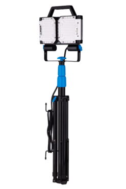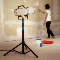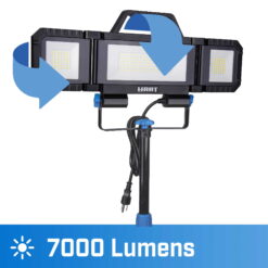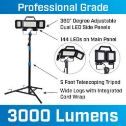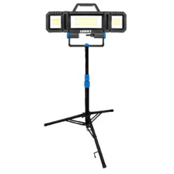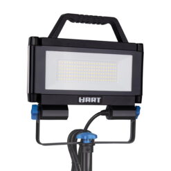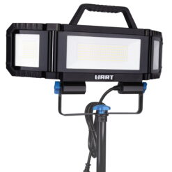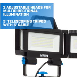 The HART 7000 Lumen Plug-in 3 Head Work Light with adjustable Tripod is the perfect addition for any large area workspace. The versatile 3-head LED light head can be adjusted to multiple angles, including front and back light at the same time. Dust and dirt resistant design for long lasting use in construction and household work projects. The Light Head measures 20″ wide and 11″ tall (including handle and base). The power cord is a 60″ 3-prong corded design for safety. Beam spread: 130′. Fully adjustable steel tripod with power cord storage. The Tripod adjusts from 27.5″ to a fully extended height of 60″. Total maximum height is 71″ (Tripod and Light Head). Easy to move and adjust to for wide variety of uses and job sights.