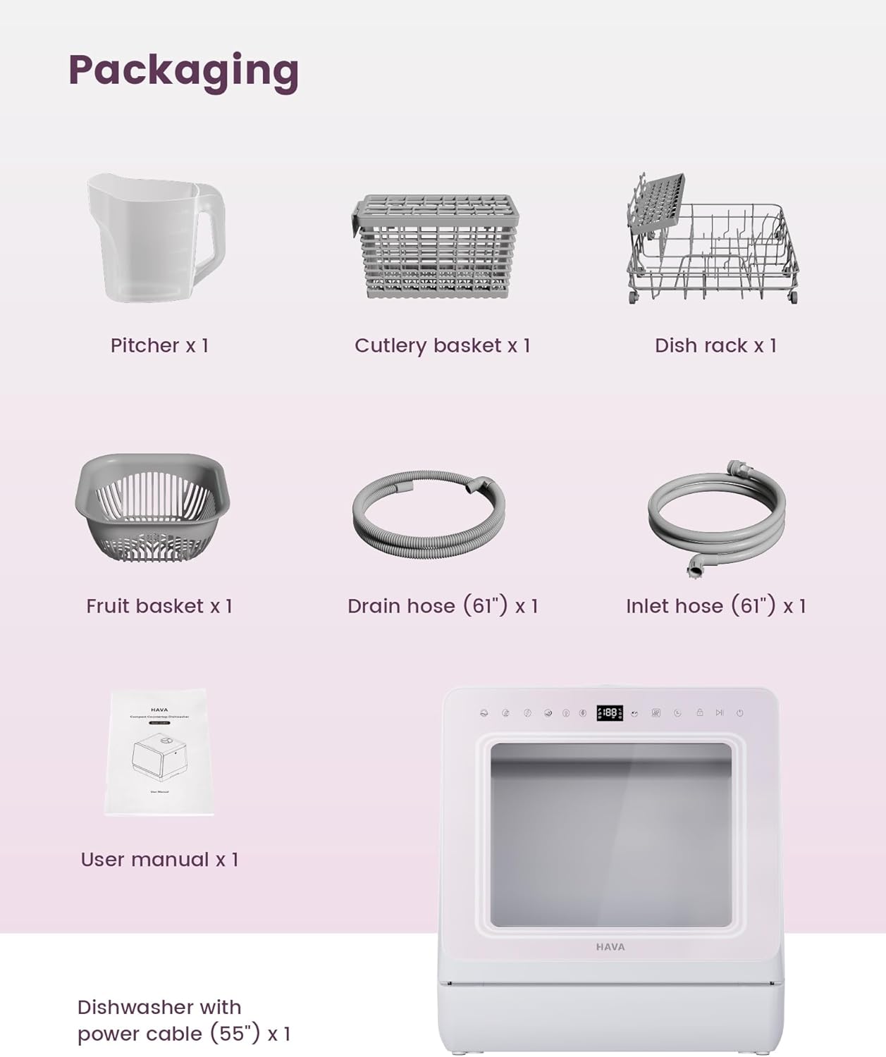 HAVA Countertop Dishwasher with Water Softener and Enhanced Energy Efficiency, Portable Dishwasher with 8 Wash Programs, Child Lock & Delayed Start Function, No Installation Needed – Misty Lilac