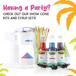 - Add a dash of flavor to nearly anything with our wide variety of syrup options at a great value. Not just for a shaved ice or snow cone machine! Check out our whole line of syrups, accessories, snowcone machines and cotton candy makers… your own mini retro soda fountain stand, right on your own kitchen counter. Dimensions are 6 ½” x 10 ½” x 10 ½” – which makes it easy to tuck under the counter or in a cabinet.