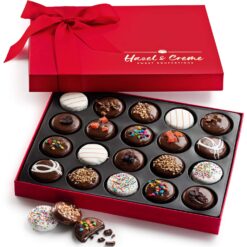 - READY TO GIFT: Give the ultimate gift of giving with this 20 piece beautiful eye popping chocolate gift box. Hazel and Creme chocolates have a delicious combination of flavors and textures. Each cookie is doubled creamed and generously dipped into dark chocolate topped with mouth watering flavorful toppings.