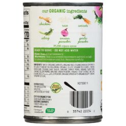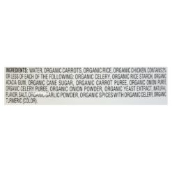 Water, Organic Carrots, Organic Rice, Organic Chicken, Contains 2% or Less of Each of the Following: Organic Celery, Organic Rice Starch, Organic Acacia Gum, Organic Cane Sugar, Organic Carrot Puree, Organic Onion Puree, Organic Celery Puree, Organic Onion Powder, Organic Yeast Extract, Natural Flavor, Salt, Organic Garlic Powder, Organic Spices with Organic Celery, Organic Turmeric (Color).
