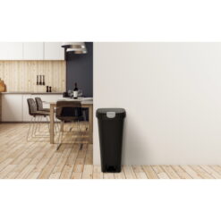 The Hefty Lockable Step On Plastic Trash Can has a locking lid to help keep curious pets and children out and easily avoid messes. The slim design in black with a 12-gallon capacity make this an ideal large kitchen trash can great for busy families who want to limit trips to take the garbage out. Use the step on pedal for easy, hands-free trash disposal. It also uses standard 13 gallon kitchen trash bag.
