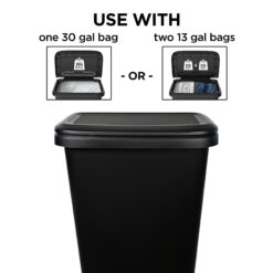 - Fits either one 30-gallon outdoor bag or two 13-gallon kitchen trash bags
