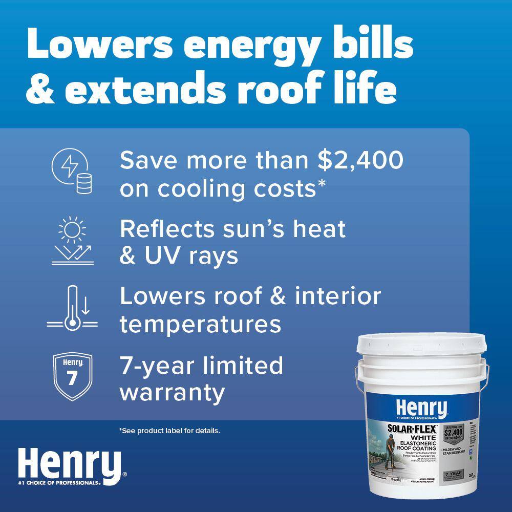 Henry 287 Solar-Flex White Elastomeric Roof Coating is a premium, elastomeric, water-based acrylic latex coating. Highly-resistant to disbonding, chalking, mildew and discoloration, this coating protects your roof from the elements while significantly reducing energy costs. 1-application provides up to 7-years of protection.
