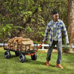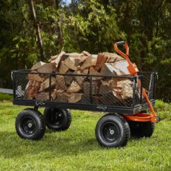 This steel utility cart is tough enough to haul up to 1200 lb. of materials. The durable steel bed has removable sides to accomodate larger items. The 2-in-1 multifunction handle makes it easy to pull the cart by hand or tow it behind a lawn tractor or ATV. The 13 in. tires are designed to tackle uneven terrain.