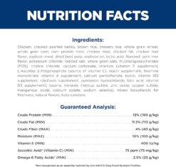 Chicken, Cracked Pearled Barley, Whole Grain Wheat, Whole Grain Corn, Whole Grain Sorghum, Corn Gluten Meal, Soybean Meal, Chicken Fat, Brewers Rice, Chicken Liver Flavor, Chicken Meal, Dried Beet Pulp, Soybean Oil, Pork Flavor, Lactic Acid, Calcium Carbonate, Flaxseed, Potassium Chloride, Choline Chloride, Iodized Salt, vitamins (Vitamin E Supplement, L-Ascorbyl-2-Polyphosphate (source of Vitamin C), Niacin Supplement, Thiamine Mononitrate, Vitamin A Supplement, Calcium Pantothenate, Riboflavin Supplement, Biotin, Vitamin B12 Supplement, Pyridoxine Hydrochloride, Folic Acid, Vitamin D3 Supplement), Taurine, minerals (Ferrous Sulfate, Zinc Oxide, Copper Sulfate, Manganous Oxide, Calcium Iodate, Sodium Selenite), Oat Fiber, Mixed Tocopherols for freshness, Natural Flavors, Beta-Carotene, Apples, Broccoli, Carrots, Cranberries, Green Peas.