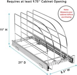 - SIMPLE & EASY TO INSTALL: This Pull Out Organizer for cookie sheet, cutting board, bakeware, and tray dimensions measure 8.5” W x 21” D x 11” H and includes easy to follow instructions with all the necessary hardware for easy installation. Our heavy-duty cutting board organizer pull out shelves arrive assembled, and installs with just a few simple screws so you can organize your cabinets in a breeze. Designed for cabinet openings 9.75 Inches and larger