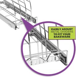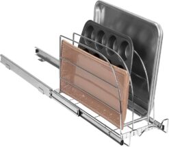 - SPACE SAVING FOR MORE USEFUL KITCHEN STORAGE: Keep baking sheets, cutting boards, cupcake trays, serving trays and other bakeware in check with this sliding kitchen cabinet organizer. No more digging around looking for your cutting board and cookie sheet supplies buried in your cabinet. Made from durable heavy wire construction, simply slide out this organizer storage rack and see how easy it is to pick out just what you need.