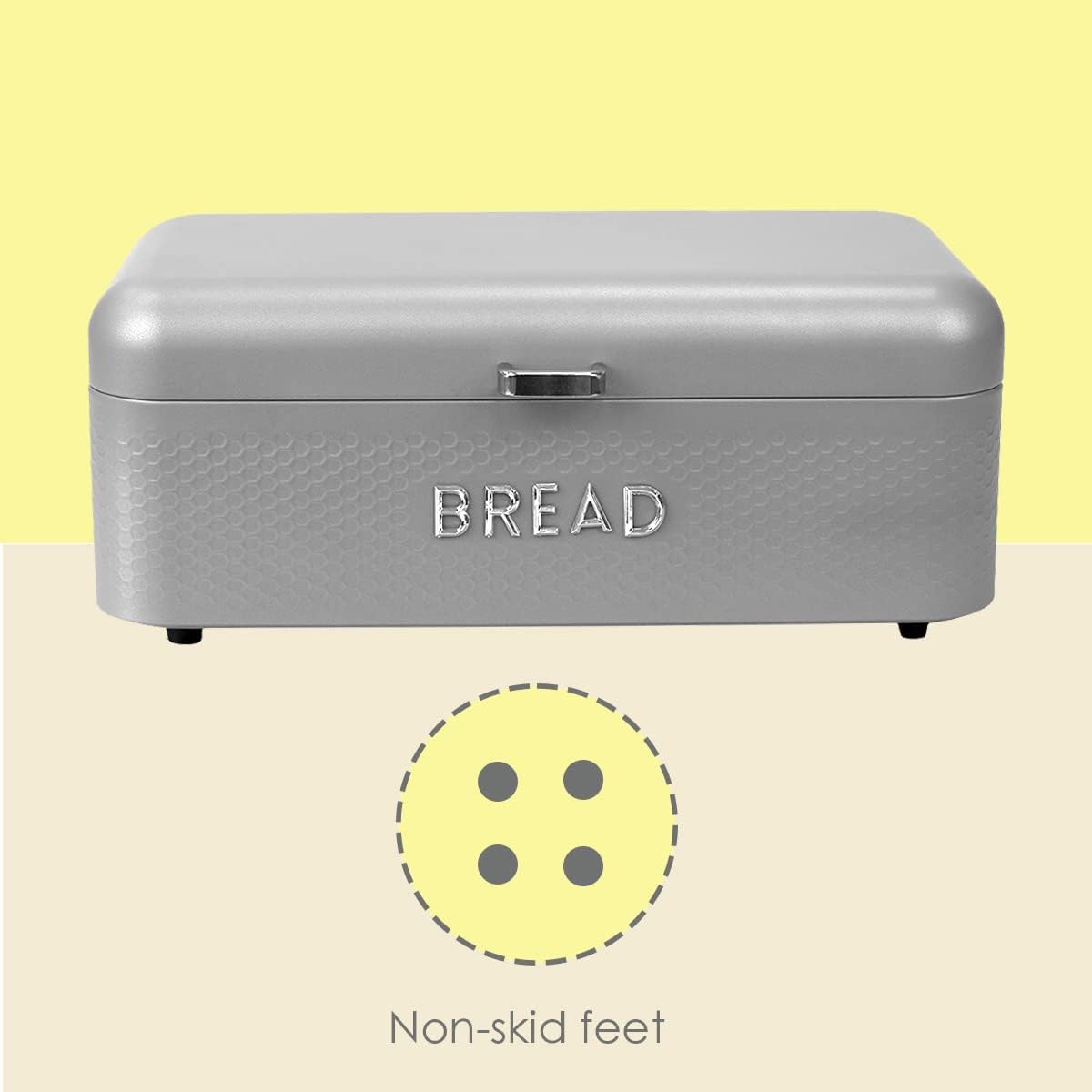 - DURABLE METAL STRUCTURE WITH NON-SKID FEET AND VENTILATION HOLES: This box for bread is made from premium-grade, sturdy metal for ultimate durability. And if the bread box is accidentally dropped, it won’t chip or dent easily. There are also non-skid feet at the bottom to prevent the bread container from sliding. Located at the back of the box, there are ventilation holes that provide proper air circulation
