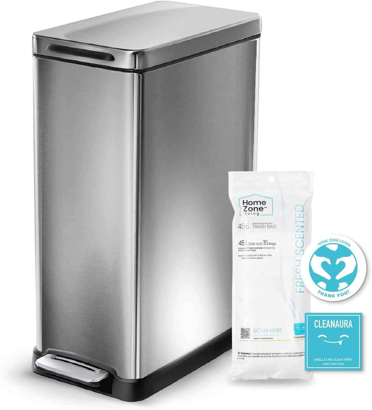 Home Zone Living 12 Gallon Slim Kitchen Trash Can, Stainless Steel, Step Pedal, 45 Liter, Silver