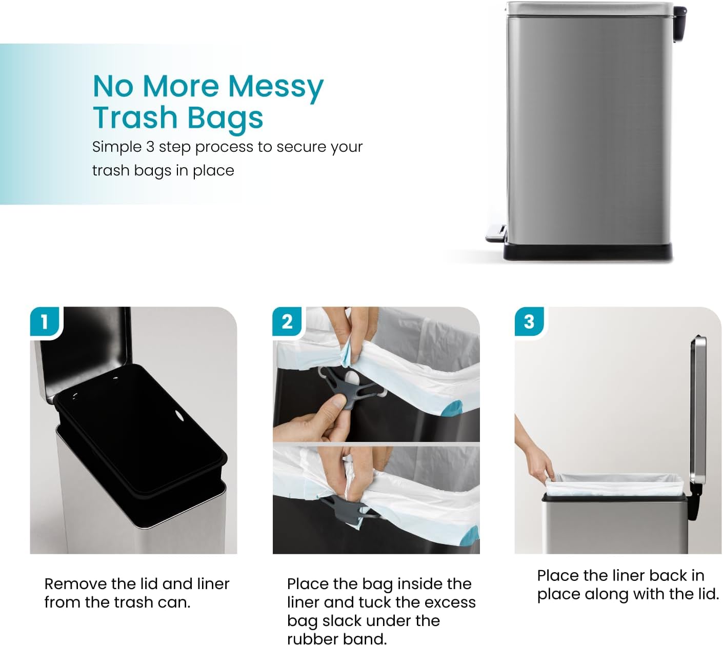- No More Messy Trash Bags – Make securing your bags in place easier simply by tucking the excess slack underneath the rubber band included on each bin. No more tying down bags, fall-throughs, or overflow.
