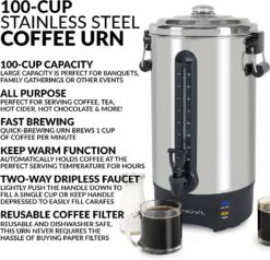 - 100-CUP CAPACITY: Large capacity makes it perfect for serving hot beverages at banquets, church functions, corporate events, family gatherings or other events