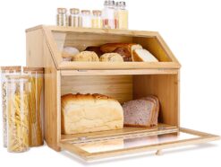HOMEKOKO Double Layer Large Bread Box for Kitchen Counter, Wooden Large Capacity Bread Storage Bin (Natural Bamboo)