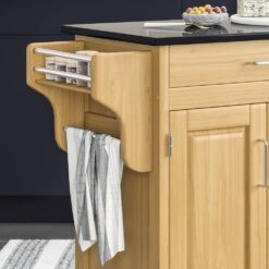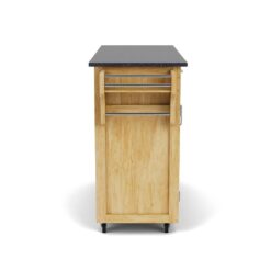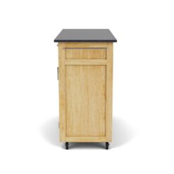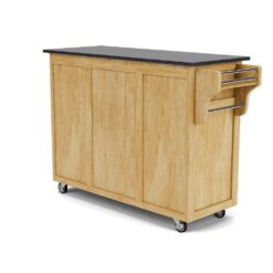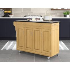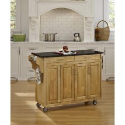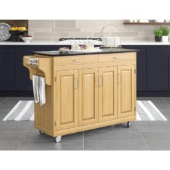 Home Styles Create-a-Cart in a Natural Wood finish with a black granite top features solid wood construction. Features include four cabinet doors open to storage with three adjustable shelves inside, handy spice rack with towel bar, and heavy duty locking rubber casters for easy mobility and safety. Size: 48-3/4 in. W x 17-3/4 in. D x 34-3/4 in. H.