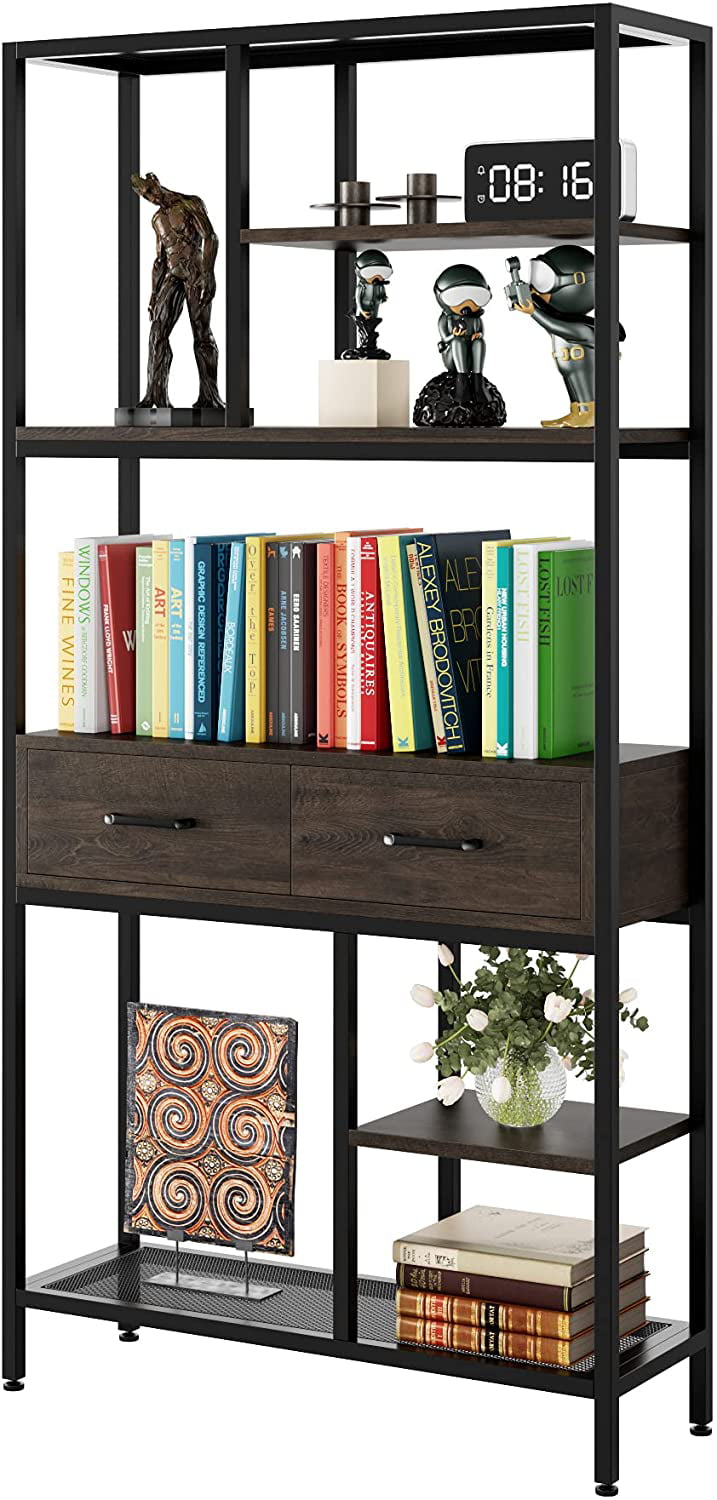 Homfa 5-tier Iron Bookcase with 2 Drawers, Industrial Tall Bookshelf with 7 open storage shelves, Free Standing Display shelf with Metal Frame, Dark Brown