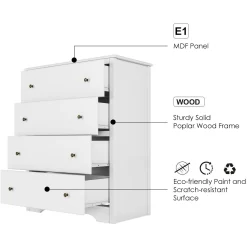 The white dresser chest with versatile clean-lined 4 drawers bring storage and delicate & elegant charm to your master suite or guest room. Construction with premium wood and strong support legs, this chest of drawers provides excellent stability and ensures long-term use. The smooth metal rails make it easy to access your wardrobe, even during a rush before work. With anti-toppling fittings to the wall, you’ll never worry about falling down.
