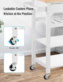 - 【Cart Handle & Towel Rack】The kitchen cart handle can be served as a towel rack, convenient to move and hang up towels and keep the trolley cart in order. Equipped with 4 heavy-duty casters, this rolling kitchen island could be swiveled freely anywhere and locked into a place. 2 lockable casters under the towel side make the kitchen island stable at certain positions.