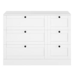 Give your living room, bedroom, or home office an instant upgrade with this refined modern dresser. The white dressers is made of premium wood with a white finish. Metal drawer pulls in a black finish add a distinctive contrast. This 6 drawer dresser has a rectangular shape with 6 drawers, offering plenty of room for clothing or spare blankets. Each drawer has a framed front and a metal slide mechanism, which is easy to open and close. Plus, its 43.31” wide and 15.75” deep top is ideal for displaying your favorite decorative items.