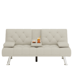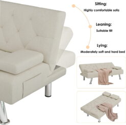 Homfa couch sofa bed is designed with exquisite tufted linen fabric and solid wood metal legs, Convertible couch sofa bed with a total weight of up to 350 pounds.This futon bed has a drop-down table in the middle with 2 cup holders provides a convenient space for drinks. 2 Side pockets conveniently hold your remote control, magazines, and more. 2 armrests can be moved at will and can be placed anywhere. The movable headrest is a perfect partner of bed which can offer suitable support to your head. It can also be used as armrests as you like.