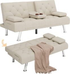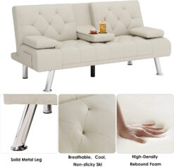 Homfa Upholstered Sofa Bed Couch, Convertible Futon Sleeper Sofa with Removable Armrests and 2 Cup Holders, Cream White