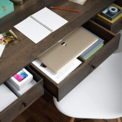 The reversible home office writing desk with drawers can provide additional storage space to help your desktop be organized. One side is 3 drawers and the back is 3 hidden cubbies. Ideal for the home office or living room settings. All legs and bases feature sturdy steel construction with a durable powder-coat matte finish. Please don’t tighten screws before assembly is finished, otherwise, they will not match the holes well.
