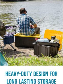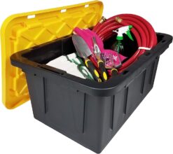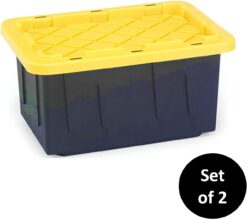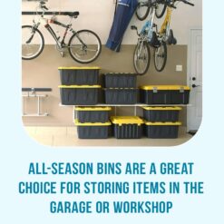 - VERSATILE STORAGE Set of two, 15-gallon containers offer the ideal organizing solution for bulky tools, sports gear, camping or hunting equipment, clothing, etc. All-season bins are a great choice for storing items in the garage or workshop.