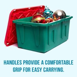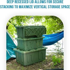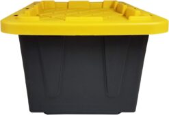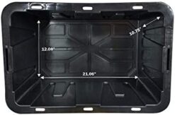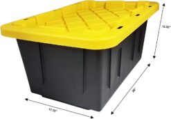 - BUILT TOUGH Constructed from durable heavy-duty plastic, these storage bins are made for long lasting usage. Lid features 6 tie down channels for added security. Each tote measures 26”L x 17.75”W x 12.25”H.