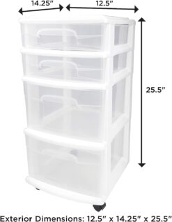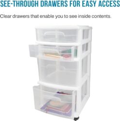 Homz Clear Plastic 4 Drawer Medium Home Organization Storage Container Tower w/2 Large and 2 Small Drawers, and Removeable Caster Wheels, White Frame