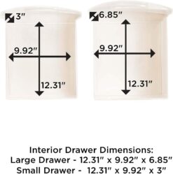 - Dimensions (L x W x H): 12.5 x 14.25 x 25.5 inches; Interior large drawer dimensions (L x W x H); 12.31 x 9.92 x 6.85 inches; Interior small drawer dimensions (L x W x H): 12.31 x 9.92 x 3 inches; Weight: 6 pounds