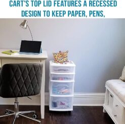 - Features 4 spacious, clear plastic drawers that each removes to transport contents with ease; Recessed lid organizes school accessories, supplies, and paperwork
