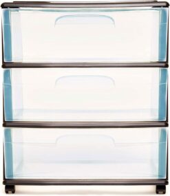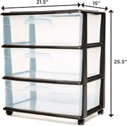 HOMZ Plastic 3 Drawer Wide Cart, Black Frame, Clear Drawers, 4 Casters included, Set of 1