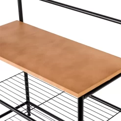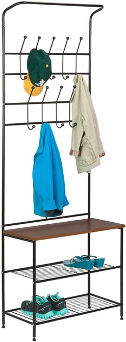 Special Feature This handy entryway organizer includes two levels of coat hooks to hold hats, jackets, keys or coats. The steel wire bottom shelves hold several pairs of shoes, or accessorize with small baskets for gloves or a dog leash. The wood storage bench is great for setting bags, purses, backpacks and more as you walk in the door.