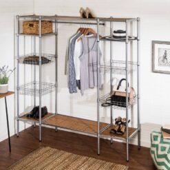 Drop that sledgehammer and move away from the drywall. With this freestanding open closet wardrobe, any wall can become a closet without needing a construction permit. The 34 in. garment rod hangs high enough for maxi dresses, suits, and your fuzziest onesies. Flanking the closet bar, four wire basket shelves and two flat shelves can hold your bags, hats, and other accessories. Two additional slatted shelves at the bottom and top run the length of the wardrobe. And the closet system stands high enough on the ground to fit shoes or slide bins underneath.