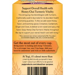 Yogi Honey Chai Turmeric Vitality tea is an intriguing Chai tea blend that combines Turmeric, traditionally used in Ayurveda for its abundant health-promoting qualities, with naturally sweet Organic Honey Flavor and rich, warming spices including Cinnamon, Cardamom, Ginger, and Clove. Enjoy deliciously spicy-sweet Yogi Honey Chai Turmeric Vitality tea throughout the day to support your overall health and well-being.