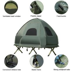 This is an ideal camping tent for explorers. The tent includes a tent, a camping bed, a carrying bag, a sleeping bag, an air mattress and air pillow, all of which are foldable and there are wheels at the bottom of the bag to make the tent easy to carry. There are 16.7 in. H metal trestles at the base of the tent to keep bugs and humidity away. and made of high quality material, can prevent sun and drizzle. The interior is ventilated, the structure is stable and the sunshade also provides a good shade place for users. Detailed installation instructions allow you to complete the installation in a matter of minutes and the foot pump can quickly inflate the mattress and pillow, suitable for camping, hiking, fishing and other activities.