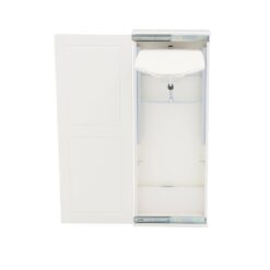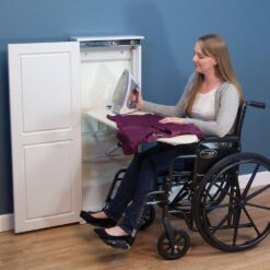 Household Essentials Iron ‘n Fold Cabinet Ironing Board is the easy-to-use, easy-to-install standing ironing board that you put away without hassle or fuss. This discreet, foldaway board looks like a simple, 2-panel cabinet. But tucked inside is the delightful foldaway ironing board. With multiple height adjustments and a stable steel top ironing surface, it is an easy way to press your clothing. This cabinet ironing board is wheelchair accessible. The cabinet has a baseboard cutout so that it stands flush against the wall. The cabinet anchors directly to the studs in your wall. It’s a secure foldaway board without the fuss of complicated installation. The ironing board cabinet is 48.5 in. H, 18.5 in. W, and 5.375 in. D; the steel top ironing surface is 41 in. L x 14.125 in. W. The door needs 36 in. of side clearance to open fully.