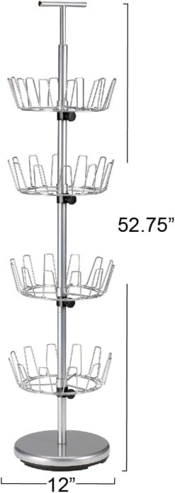 Organize your footwear in style with this 4-tier revolving shoe tree. With its elegant design and functionality, it’s the perfect addition to your bedroom or entryway. The highlight of this shoe rack is its 4 revolving tiers, capable of holding up to 24 pairs of shoes. Each tier can rotate independently, allowing you to easily find and select your desired pair. The rack accommodates various shoe styles, including sneakers, heels, boots, and more. Its vertical storage design maximizes space efficiency while keeping your shoes off the floor. The weighted base and sturdy metal frame ensure stability and durability. With a convenient handle at the top, you can effortlessly move the shoe tree wherever needed. The chromeline frame adds a touch of elegance to any room. This shoe tree comes fully assembled, ready to use right away. Simplify your shoe organization and enhance your living space with this stylish and functional revolving shoe tree.