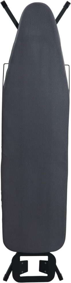 With stunningly chic style and a smart design, this deluxe ironing board stands out from the crowd. Using this ironing board promises crisp results on button-ups, slacks, bedsheets, tablecloths, curtains and more. Unlike SOME other ironing boards, this boasts a high-quality mesh steel top. This durable mesh offers more stability and allows steam and heat to circulate through fabric for better, faster and more even results than you’d get with other steel-top boards. This improved circulation also prevents the build-up of excess moisture or damp spots. This steel mesh top is a must-have feature for anyone who irons frequently, especially with steam or higher temperatures. This ironing board utilizes additional improved features, including durable hex legs with skid-resistant caps and a sleek, elegant matte black finish. The 4 hex legs cover a greater surface area to provide the best form of stability. The gray FiberTech cover attaches to the ironing board with a simple drawstring cord. Underneath the cover is a high-quality, 6mm-thick fiber pad. This thick layer prevents imprints from the steel ironing surface transferring onto your garments and creates a smoother finish. The cover and pad has been stress tested to ensure durability and resistance to high temperatures. This ironing board creates enviable results and is highly convenient. Attached to the end of the board is an iron rest outfitted with heat-resistant silicone pads. This serves as a safe and reliable spot to rest your iron as it warms up and cools down. This iron rest has multiple slots to hang articles of clothing within reach. The board has 4 height settings that can be adjusted with a quick push of a lever. This deluxe ironing board can be folded down for compact storage. It can easily hang behind a door, on the wall or inside a closet. The modern matte finish and functionality of this ironing board make it the prime choice for anyone looking to complete their daily ironing in style.