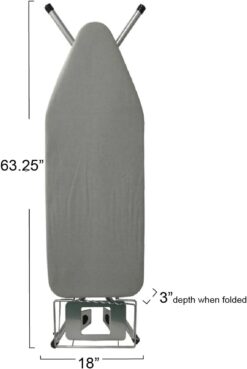 - Open: 29.5-36.5″ H (ironing surface: 18″ W x 49″ L), closed: 62.5″ H x 2″ D