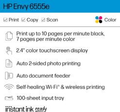 The HP Envy 6555e All-in-One delivers color printing, scanning and copying, plus a 35-sheet auto document feeder and 100-sheet paper capacity. It includes wireless and mobile printing capabilities to keep your multifunction printer connected, and prints highquality documents and photos every time with true-to-screen tech. This inkjet printer also lets you easily navigate print jobs with its intuitive color touchscreen.