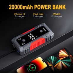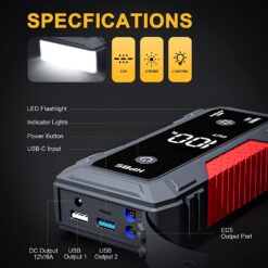 - 【Multifunctional Car Jump Starter】This jump starter box can be used as a mobile power bank (Input:18W Type-C, Output:USB 5V 2.4A, USB 5V/9V/12V Quick Charge) LED flashlight with 3 modes( flashlight, SOS, strobe). to help you in the dark or in emergencies.