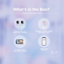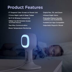 With pristine, High-Definition picture quality, Hubble Nursery Pal Cloud makes it crystal clear that our baby monitors are no longer just for parents. Routinely pan, tilt, and zoom from the 5” smart parent unit to maintain the perfect view of your little one. Track climate conditions with the room temperature monitor and soothe your baby with the sweet sound of your voice using two-way talk communication. Preloaded nature sounds, lullabies, and bedside stories gently lull your baby to sleep, while the 7-color night light and sleep trainer ensure that sleep brings them peaceful, pleasant dreams. Give yourself the peace of mind you deserve with Hubble’s Nursery Pal Cloud. More Than Just a Baby Monitor.