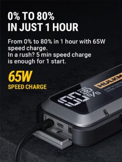 - [0% to 80% in JUST 1 HOUR]: With our unmatched 65W Speed Charge Tech., it only takes an hour to charge the Alpha 85 Jump Starter from 0% to 80%, and can be fully-charged in 90 minutes. When fully charged, this device can hold the electricity up to 18 months. A 5-min charge can provide a single jump-start!
