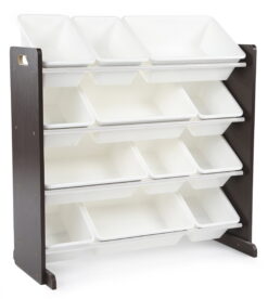 Playtime becomes more fun when your kids can easily take out their toys, books and games and then quickly clean up afterwards. The space saving Humble Crew Toy Storage Organizer with 12 Storage Bins stows your children’s toys in easy access BPA and phthalate free plastic storage bins. 8 standard and 4 large colorful storage containers are easy to remove, replace and reposition along the 4 tiered organizer shelves. Storage bins are sized just right within the toy organizer for toddlers and preschool aged children. Sturdy engineered wood construction frame with stabilizing braces and steel shelving rods, 20 pound weight capacity per level. Some assembly is required. A great toy storage box alternative helping keep your little one’s room clean and organized while at the same time teaching color identification, sorting and cognitive skills. Perfect organizational solution for bedrooms and playrooms.
