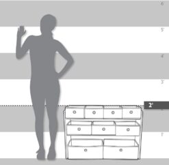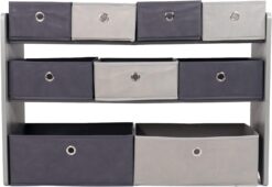 - Product sizing— Organizer: 36″W x 12″D x 24″H, Small fabric bin: 9″W x 12″D x 5″H, Medium fabric Bin: 12″W x 12″D x 5″H, Large fabric bin: 17″W x 12″D x 7″H.