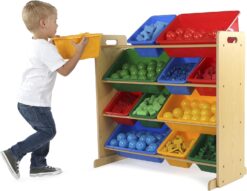 This space-saving Tot Tutors Kids Toy Storage Organizer with 12 Plastic Bins stores lots of children’s toys in easy-to-see, easy-to-access plastic bins. The 8 standard and 4 large easy access storage containers are removable, making it fun for kids to take out toys, books, and games for playtime and quick to clean up after. This toy storage box alternative helps keep your little one’s room clean while at the same time the bins can teach color identification as well as sorting and cognitive skills.