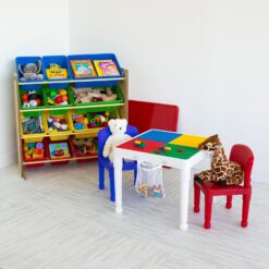 The height of the bins in this toy organizer is just right for toddlers and preschool-aged children. This piece of furniture is a great fit for all homes, whether large or small. This toy storage organizer comes in multiple color options to complement the existing furniture in your home as well as the table and chairs sets and other toy storage organizer products in Tot Tutors’ line of kids furniture. Color options include Primary Collection: natural finish with primary bins (red, green, blue, yellow); Pastel Collection: white finish with pastel bins (pink, light green, baby blue, light yellow); Espresso Collection: espresso finish with white bins; Summit Collection: white finish with primary color bins (red, green, blue, yellow); Friends: White finish with pink and purple bins (pink, purple, dark pink, white).
