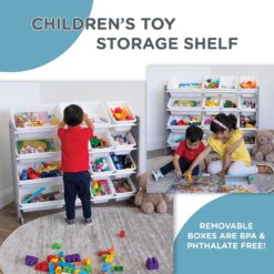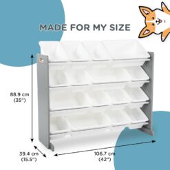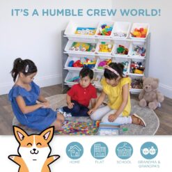 Playtime is more fun when your kids can easily take out their toys, books and games and then quickly clean up afterwards. The space-saving Humble Crew Super Sized Toy Storage Organizer with 16 Storage Bins stows your children’s toys in easy-to-see, easy-to-access BPA and phthalate free plastic storage bins. Stylish colorways make it ideal for organizing your child’s nursery, bedroom, playroom, closet, even the living room….the options are endless! The 12 standard and 4 large storage containers are easy to remove, replace and reposition along the 4 tiered shelves—sized just right within the toy organizer for toddlers and preschool-aged children. It makes a great toy box storage alternative, helping keep your little one’s room clean and organized while at the same time teaching sorting and cognitive skills. Made with a sturdy engineered wood construction frame and steel shelving rods, each level can hold up to 20 pounds. Some assembly is required and all hardware is included. Product sizing – 42″W x 11″D (16″D with stabilizing braces) x 32″ H Standard bin sizing: 12″ L x 9″W x 6″ H Large bin sizing: 16″L x 12″W x 6″H Additional plastic storage toy bins are sold separately.