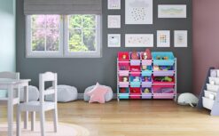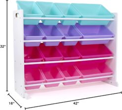 Playtime is more fun when your kids can easily take out their toys, books and games and then quickly clean up afterwards. The space-saving Humble Crew Super Sized Toy Storage Organizer with 16 Storage Bins stows your children’s toys in easy-to-see, easy-to-access BPA and phthalate free plastic storage bins. Stylish colorways make it ideal for organizing your child’s nursery, bedroom, playroom, closet, even the living room….the options are endless! The 12 standard and 4 large storage containers are easy to remove, replace and reposition along the 4 tiered shelves—sized just right within the toy organizer for toddlers and preschool-aged children. It makes a great toy box storage alternative, helping keep your little one’s room clean and organized while at the same time teaching sorting and cognitive skills. Made with a sturdy engineered wood construction frame and steel shelving rods, each level can hold up to 20 pounds. Some assembly is required and all hardware is included. Product sizing – 42″W x 11″D (16″D with stabilizing braces) x 32″ H Standard bin sizing: 12″ L x 9″W x 6″ H Large bin sizing: 16″L x 12″W x 6″H Additional plastic storage toy bins are sold separately.